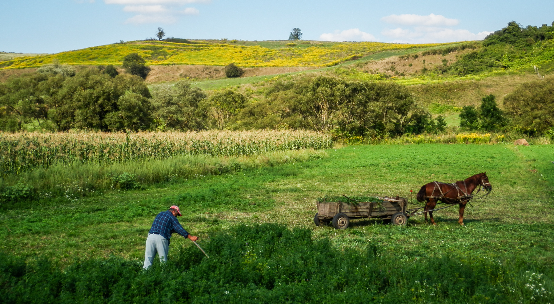 Due to the hilly landscape, the mechanized agriculture never became predominant in Transylvania. Small scale farming is still widespread here, with the family obtaining almost everything it needs for living from the piece of land they work. Here you can still witness carts pulled by horses, grass cut by scythe, corn or potatoes cropped by hand.